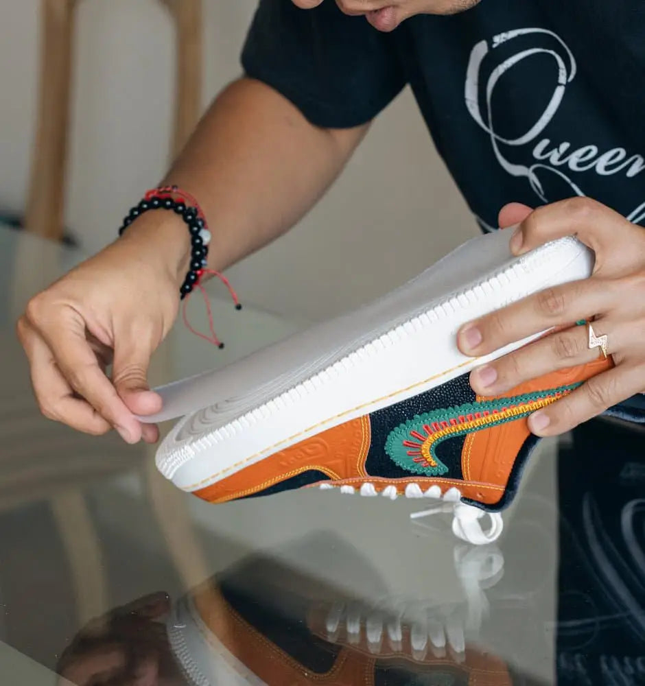 - Aplica el sticker en la suela, ejerciendo presión y calor con tus manos. Para un mejor resultado, puedes usar una secadora de cabello para asegurar una adherencia precisa.